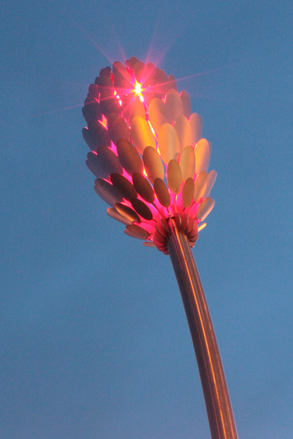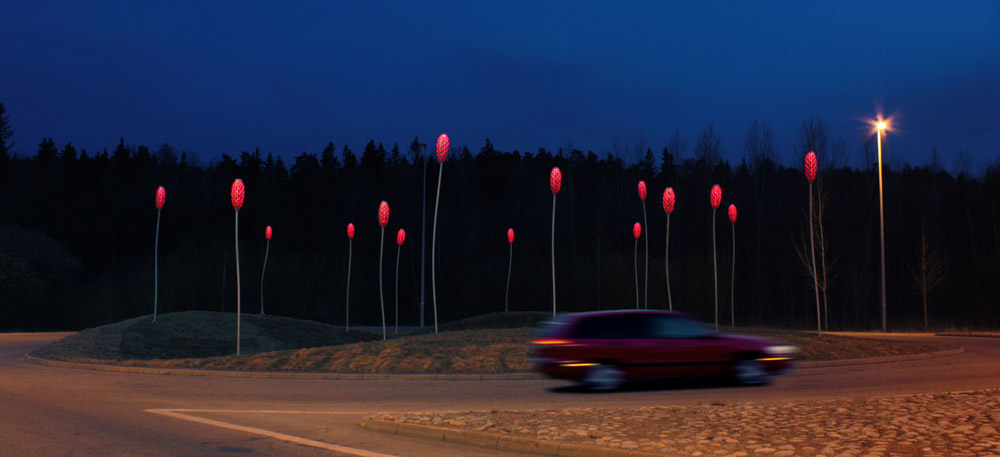 Gestaltningen utgår från de givna markförhållandena, dvs en liten damm och två vegetationstyper: våtäng och torräng. Jordmassor har tillförts, marken har bearbetats och fått en organiskt mjuka former. Landskapet har också förstäkts med 15 st lysande "plantor".Knopparna är i tre olika storlekar och stjälkarna har olika längder och krökningar.I samarbete med landskapsarkitekt Torsten Wallin