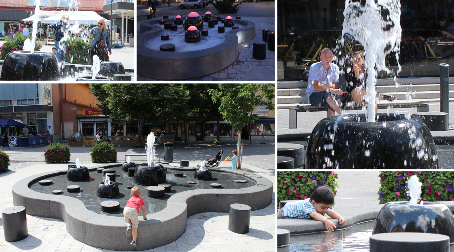 Material:sten, terazzo, LED-ljus. Datorstyrt vatten och ljusspel. Vintertid täcks vulkanerna med huvar av polycarbonat.