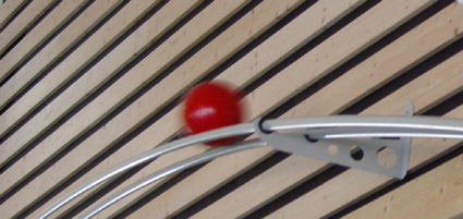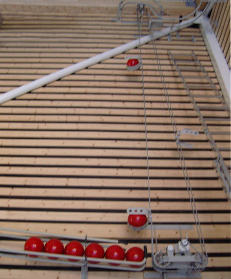 Vunnen öppen tävling. Bollbanan löper längs väggarna i simhallen. Varje hel timme startar motorn som går 5 min och driver bollhissen. 8 st bollar hinner rulla iväg och runt hela banan.I samarbete med Jan Stenberg.