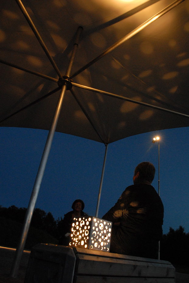 Boxar att sitta på av lärk och sandgjuten aluminium, tält som skydd mot väder, rostfri vattenskruv att dricka från, lysande lykta, antik kompass mm.