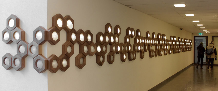 Material: valnötsträ, gjutet glas, LED-ljus som dimras långsamt upp och ned.