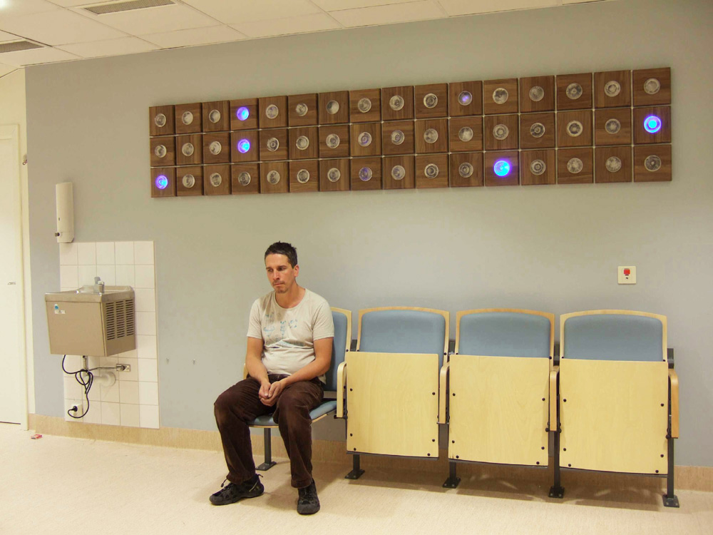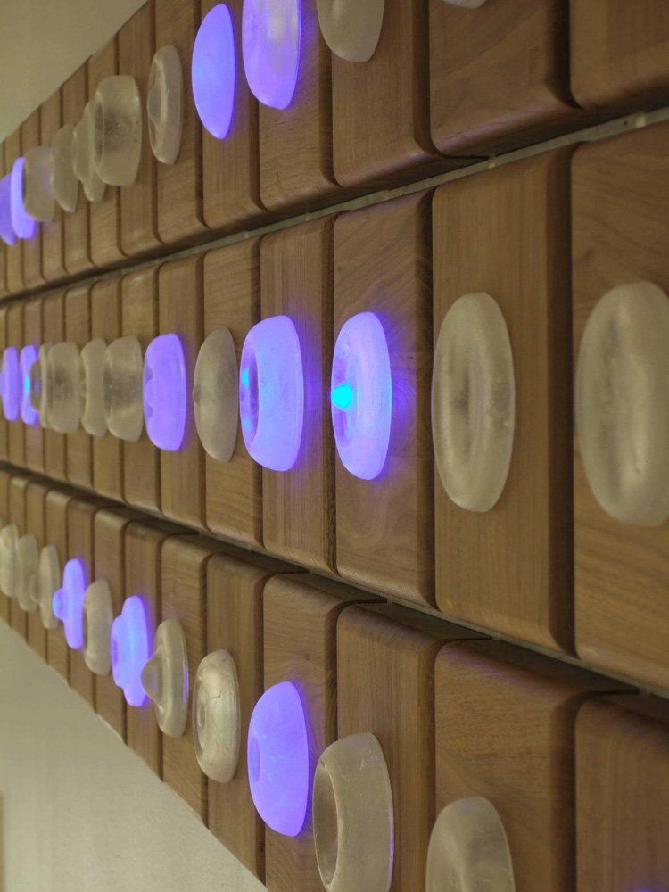 Varje ljuspunkt tonar upp under 1 min. Ordningen är till synes slumpvis. Efter 48 min lyser alla. Därefter tonar de sakta ned samtidigt. Alla glasdelarna har olika form.