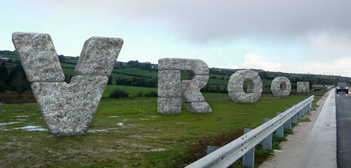 Inbjuden parallellskiss efter prekvalificering. Förslag till gestaltning för två avsnitt av den nya motorvägen nära Limerick i Irland. Material: irländsk granit, glasfiberamerad plast (svalorna)